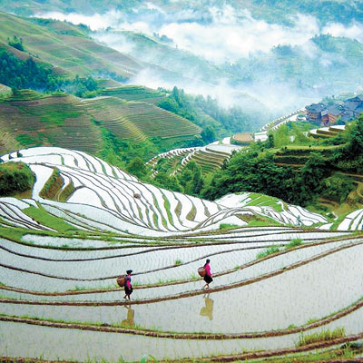After breakfast, travel to the magnificent Longji Rice Terraces fields spread across the hills like fingerprints , where the layered , offering breathtaking views electric cart . Take an up the hill and enjoy panoramic views from the Jiulong Wuhu Scenic Platform over the golden (or green ) terraces. Return to Guilin in the evening and check in at your hotel .